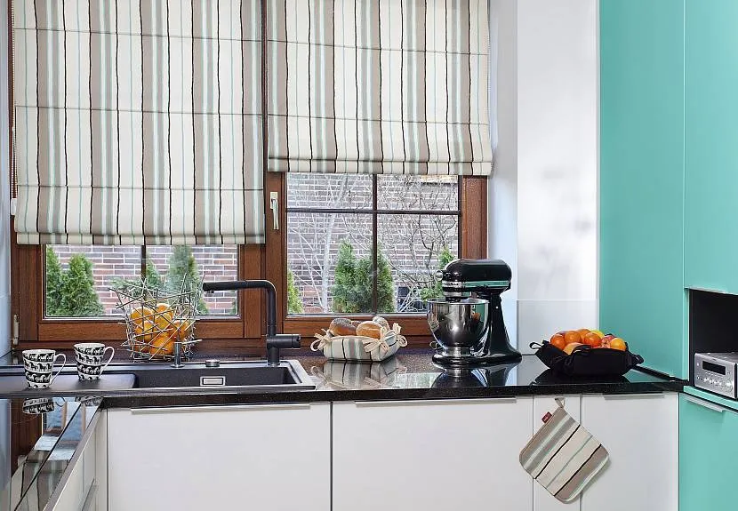 Самые эффектные шторы приобретаются для гостиной, но для кухни важнее рациональность: соображение практичности и безопасности. Поэтому здесь в ходу декор, заканчивающийся над подоконником или чуть ниже, например, римские модели. Если помещение просторное, а окно находится около столовой зоны, допустимы шторы, заканчивающиеся над самым полом. Если на кухне есть балкон, портьеры стоит дополнить планками-утяжелителями.