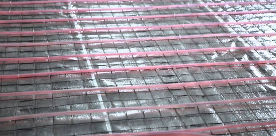 Металлическая арматурная сетка располагается не на черновом основании пола, а в центре заливки. Для получения качественного покрытия проводится обязательная гидро- и теплоизоляция бетона в случае укладки свежей стяжки или очистка старого пола от грязи. При строительстве с нуля возможно размещение толстого слоя утеплителя, при заливке поверх старого основания лучше остановиться на пенофоле. Поверхность, которая будет заполняться бетоном, обрабатывается грунтовочными составами для увеличения адгезии и предотвращения плесени.