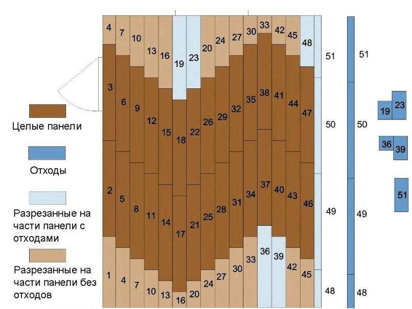 Наиболее рациональная схема укладки представлена выше и получается при использовании обрезка из предыдущего ряда для начала следующего. Разумеется, куски длиной менее 0,4 м превращаются в неиспользуемые отходы. Заметим, что и пилить ламинированные панели в этом случае придется меньше всего.