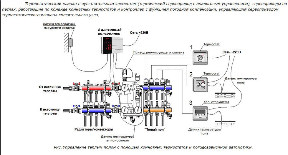 Сигнал в виде изменённого напряжения, поступающего по проводу от термостата, приводит в действие механизм осуществляющий нажим на шток клапана вывода возвратной балки коллектора. Тем самым, происходит управление прогревом контура под полом определённого помещения.