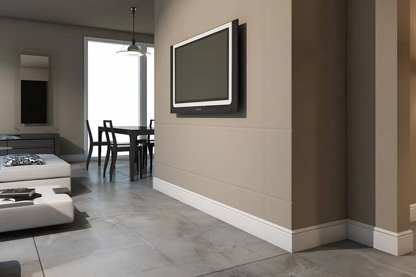 Широкий напольный плинтус поможет замаскировать неровности стены и скрыть небольшие погрешности