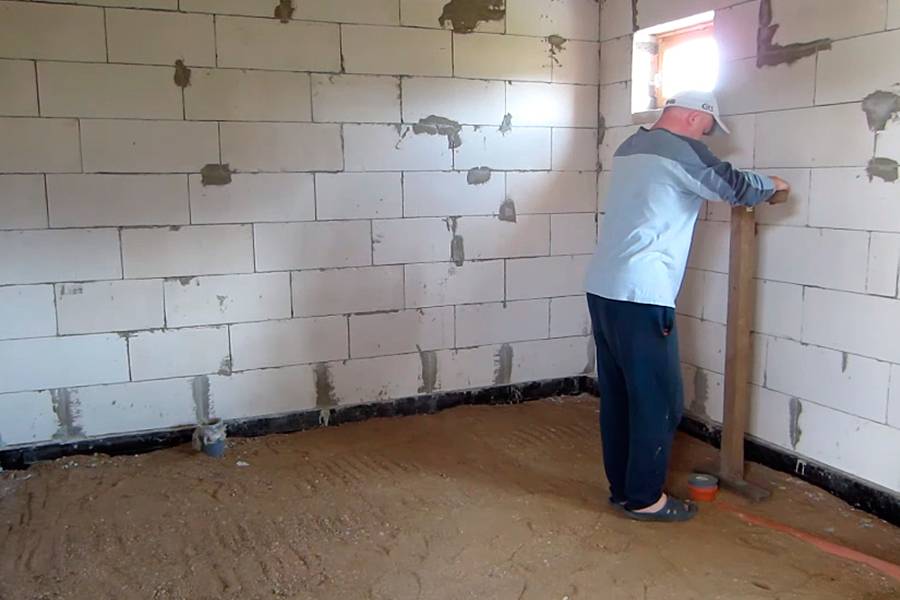 Направляющие укладывают вдоль стен, перпендикулярных той, в которой расположена дверь. Расстояние между ними не должно превышать размера используемого правила: оно скользит по направляющим, выравнивая выложенный раствор. При выравнивании раствора его нужно будет двигать из стороны в сторону, так что оставьте в запасе еще 10-20 см (при длине правила 150 см располагайте направляющие через 110-120 см).