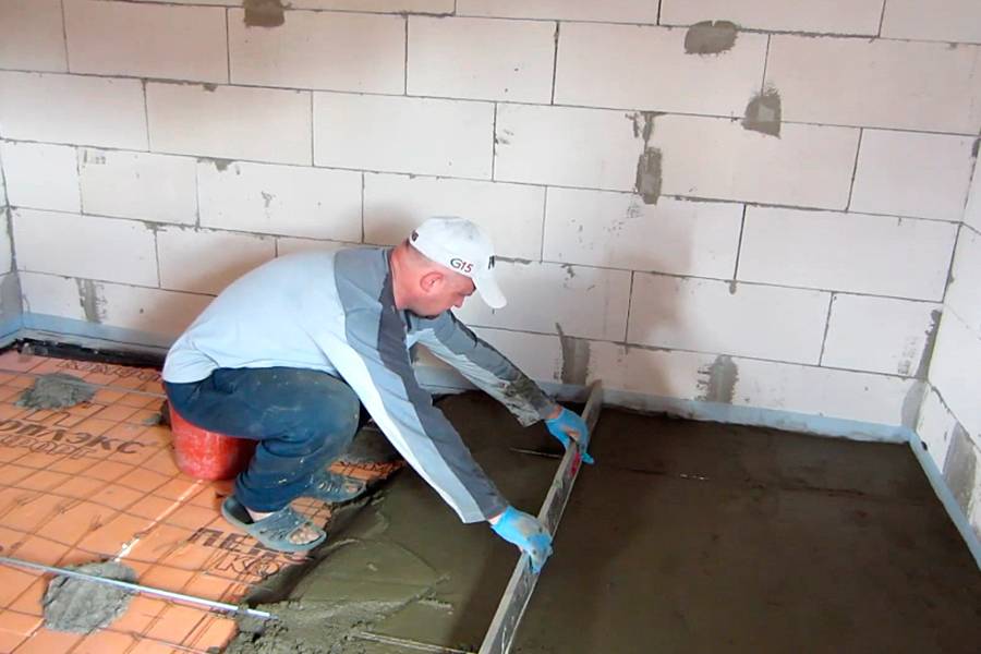 Лучший вариант — керамзитобетон. Из пенобетона подходят только сорта, устойчивые к влаге. Поверх этого слоя наносится уже чистовая стяжка. Она должна иметь толщину, достаточную для создания необходимого углубления для слива.