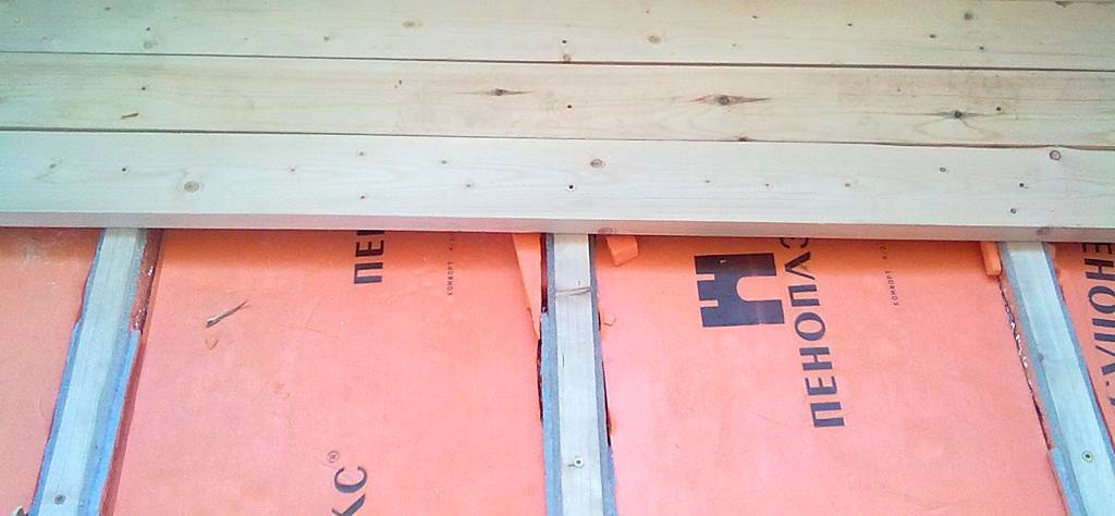 Шаг 1. Для теплоизоляции поверхности пола утеплителем заполняется пространство между лагами, если утепляется поверхность стен – обустраивается каркас из деревянных брусков (также можно сделать его из металлического профиля).