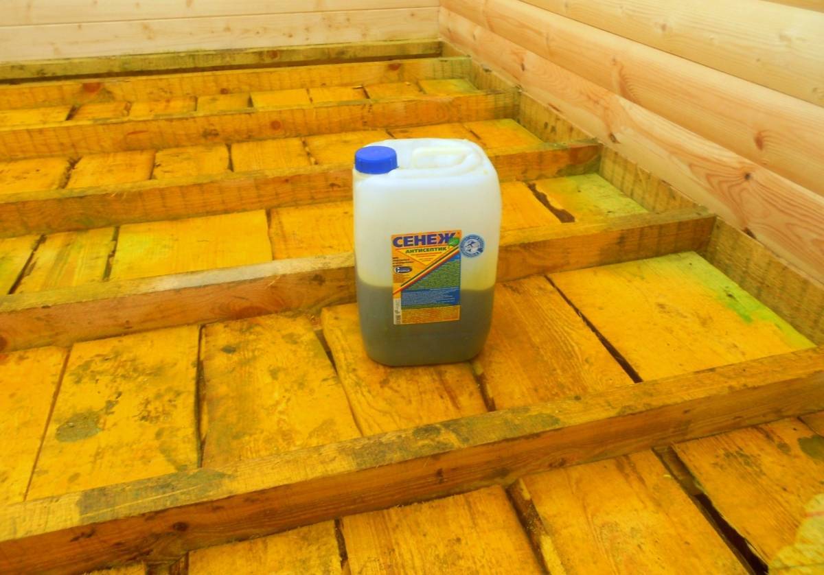 - Антисептик с органическим растворителем. Придает поверхности повышенную влагоустойчивость и прочность. Может применяться для внешних и внутренних работ. Такой пропиткой также можно обрабатывать полы в парилке.