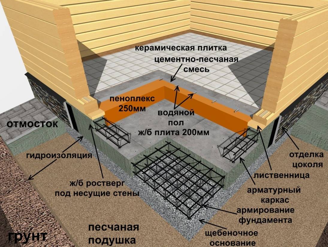 Фундамент обязательно должен быть защищен гидроизоляцией, иначе он со временем начнет гнить. Поверхности, которые чаще всего будут контактировать с водой, желательно покрыть несколькими слоями пропитки. Пользоваться баней можно только после полного высыхания применяемого состава.
