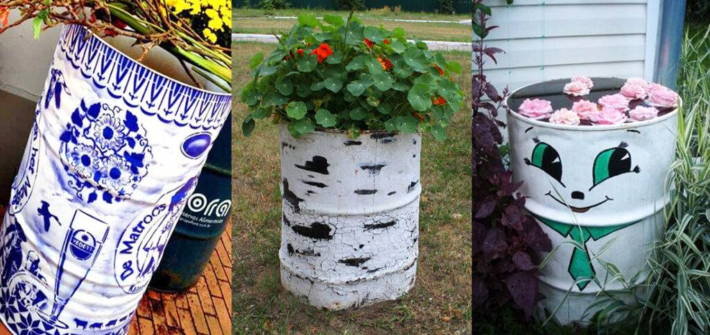 С помощью покупного или самодельного горячего ножа из бочки без рёбер жёсткости можно изготовить садовый вазон. В него сажают не только обычные растения, но и водные, превращая изделие в мини-прудик.