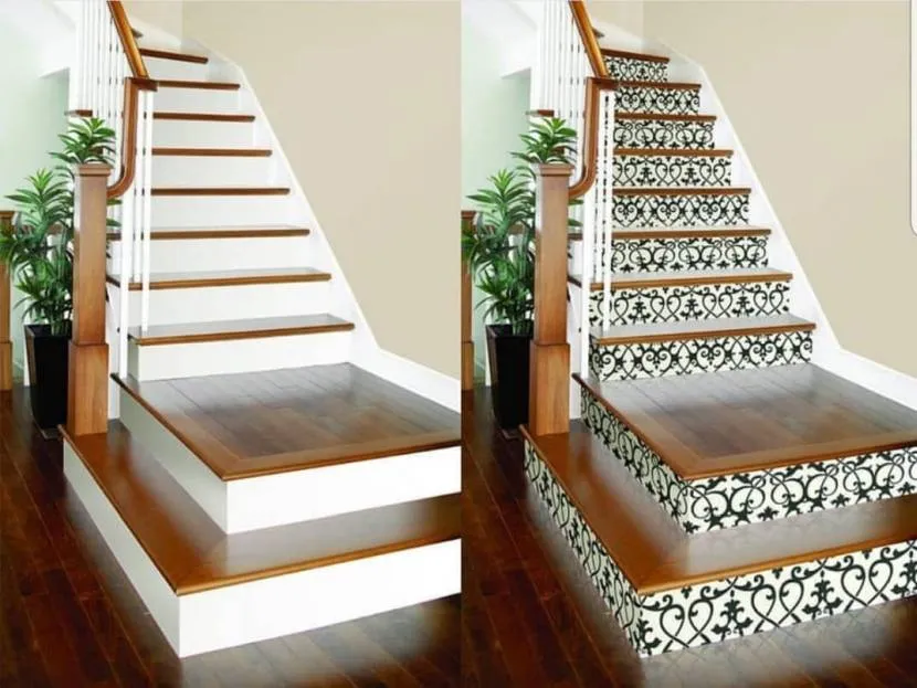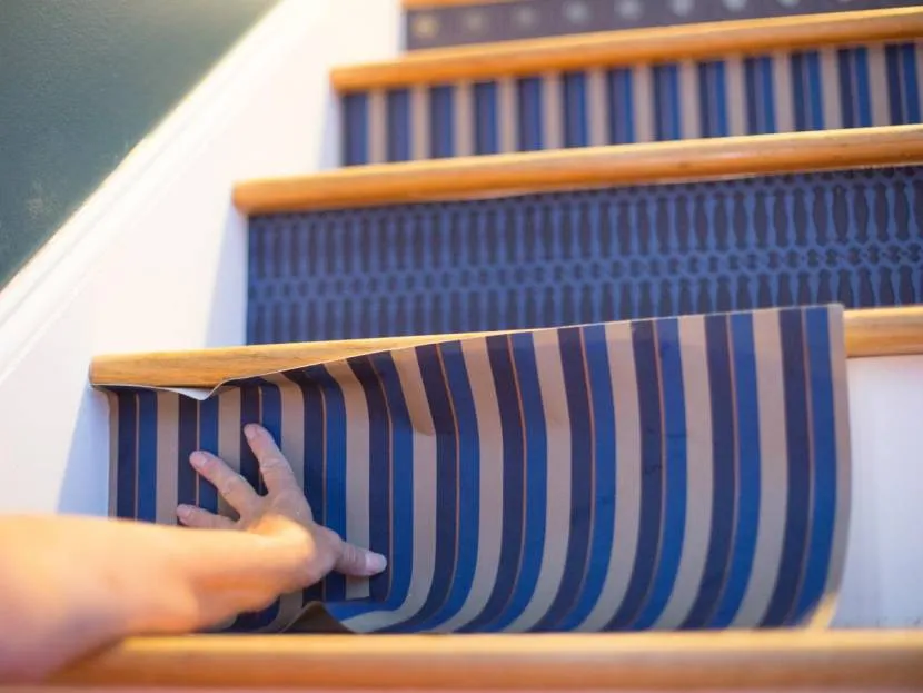 Стильно будет смотреться внутренняя лестница, которая будет оклеена остатками материала на подступенниках. Сюда отлично подойдут остатки обоев, которые устойчивы ко влаге, а также прекрасно гармонируют с цветов окружающего интерьера. Прекрасно будет выглядеть и контрастный геометрический рисунок, или же традиционные орнаменты.