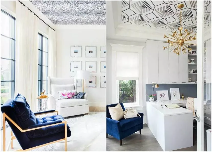 Если от прошлого ремонта осталось один-два рулона шпалер, с их помощью можно креативно оформить потолок. Метод подходит для современных и классических интерьеров. Рекомендуются нейтральные оттенки с неброским узором, находящим отражение в остальном декоре. Если необходимо получить эффект объема, используйте материал с фактурной поверхностью.