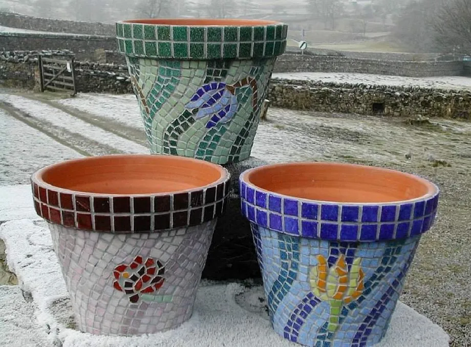 Украшение цветочных горшков мозаикой из остатков плитки.
