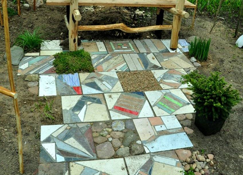 - Дорожка из битой плитки — прекрасное решение, если у тебя недавно был ремонт и осталось много испорченного или неизрасходованного материала!