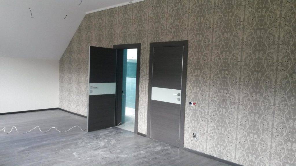 Если сначала кладется пол, то профессионалы рекомендуют оставлять по одной полосе справа и слева от проема, и наклеивать их уже после окончания дверных работ. Многим такой расклад кажется неудобным, и их выбор склоняется в сторону первоначальной установки дверной системы, в которую входит и поклейка недостающих обоев.