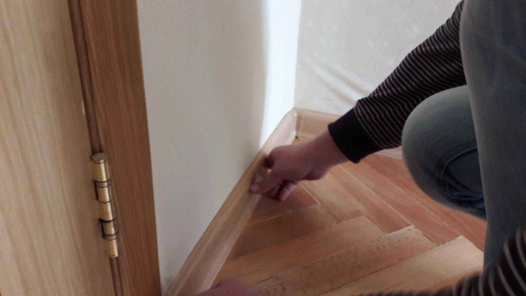 Шаг 2. Ламель укладывается на пол и вставляется под наличник.