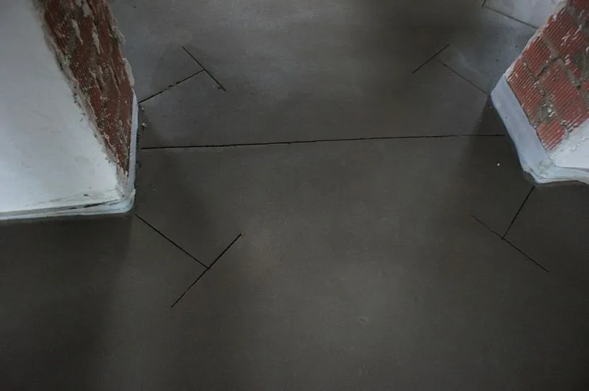 Усадочные швы помогают избежать появления хаотичных трещин на поверхности бетонного покрытия, вызванных неравномерным усыханием стяжки. Нарезка швов данной разновидности создает в толще стяжки прямые плоскости слабины. По мере застывания бетона швы будут слегка расходиться, а трещины формироваться строго в заданных областях.