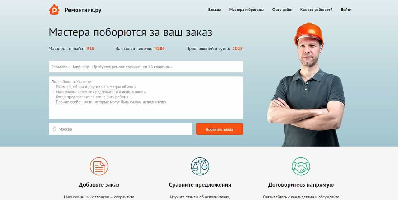 Это узкоспециализированный сайт, здесь есть только мастера по ремонту и строительству, инженеры, архитекторы и дизайнеры. Процесс поиска исполнителя такой же как на PROFI.RU и YouDo.