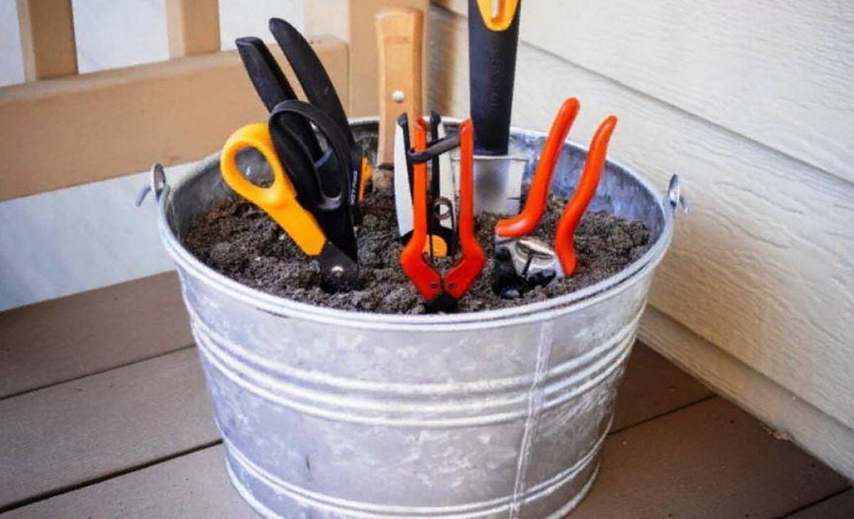 Это еще один вариант размещения мелкого инструмента на огороде. Наверняка у вас где-то валяется ржавый ненужный таз, который и подойдет для этой идеи. Насыпьте в него песка, пропитайте машинным маслом и воткните мелкие садовые инструменты. Песок не даст быстро затупиться, а также предохранит от преждевременной коррозии металла.