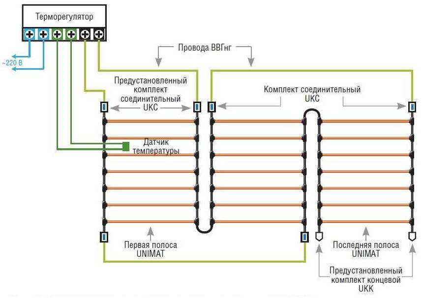 Подключения всех отрезков плёнки к терморегулятору выполняют параллельно.