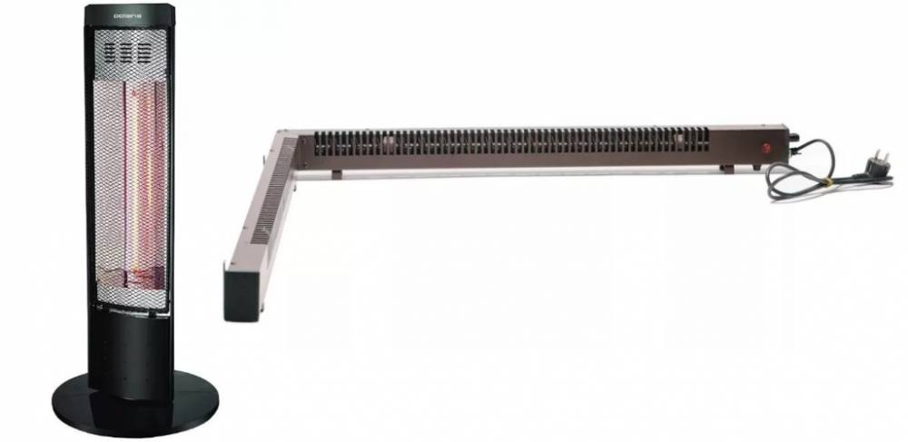 Напольные электроприборы отличаются меньшей эффективностью, по сравнению с потолочными, потому что поток излучения у них направляется не прямо, тем самым обогрев усложняется. Для домашнего применения лучше всего выбирать прогрессивные карбоновые устройства. Их нагревательные элементы выполнены в виде кварцевой трубки с углеродной спиралью внутри. Хотя при работе они излучают не слишком приятное для органов зрения красноватое свечение. Керамический элемент так не светится, зато уступает по качеству.