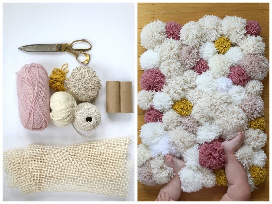 1. Сделайте помпоны разных цветов, чтобы получился плавный градиентный переход цвета. Можно сделать однотонный коврик или выложить определенный узор. Также можно поиграть с размерами помпонов, используя крупные, поменьше и совсем маленькие. Для этого посмотрите тут, каким лучше способом делать помпоны разного размера.