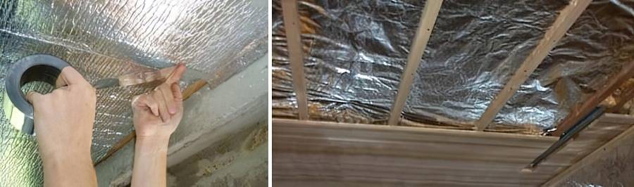 Утеплить снизу бетонные плиты можно минеральной ватой, пенополистиролом, изолоном, напылением эковаты или пенополиуретана. По потолку выполняется гидрозащита пропиткой, после чего на него, кроме случая с изолоном, лучше смонтировать с нужным шагом бруски (можно обойтись и без них), между которыми плотно вставить плиты теплоизоляции. Затем поверх брусков монтируется обрешётка, конструкция которой выполняется в соответствии с выбранной финишной отделкой.