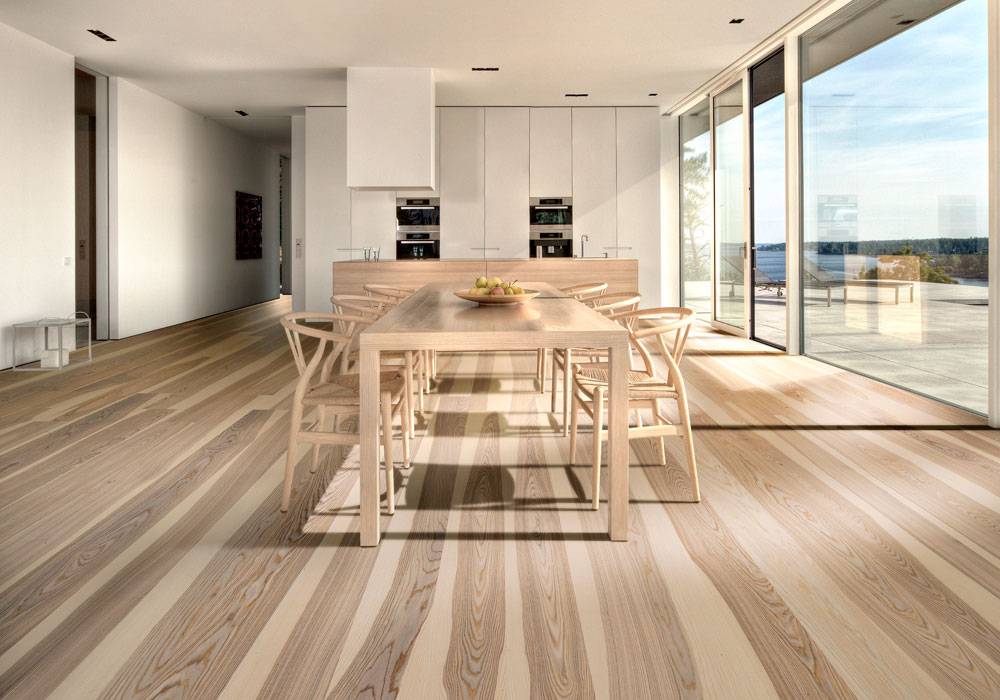 Может показаться, что белый пол не будет работать на кухне, однако, благодаря соответствующей пропитке, он может быть защищен от пятен или другой грязи. Благодаря нескольким покрытиям лаком с использованием УФ-технологии, пол будет отвечать высоким критериям качества