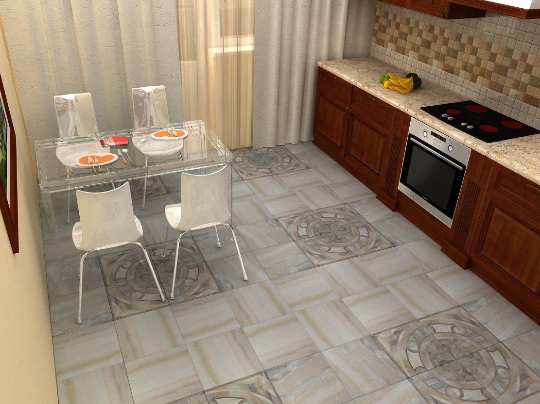 Комбинация плитки с паркетной доскойКерамика под деревоПокрытие под мраморМатовая керамика в небольшой кухнеПэчворк на кухонном полуПокрытие с небольшими прямоугольными вставкамиСоздание объемного рисунка с помощью мозаикиНапольное панноУникальный орнамент Еще один вариант отделки под мрамор