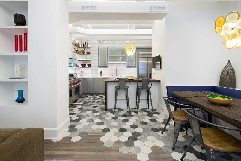 Плиточные прямоугольные или квадратные модули, несмотря на свою незамысловатость, придают полу очень выразительный вид и моделируют пространство, например, делая удлиненную и узкую кухню гораздо пропорциональнее.