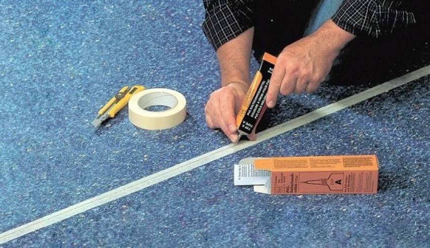 При укладке линолеума из двух полос для соединения их в месте стыка используют скотч или холодную сварку.