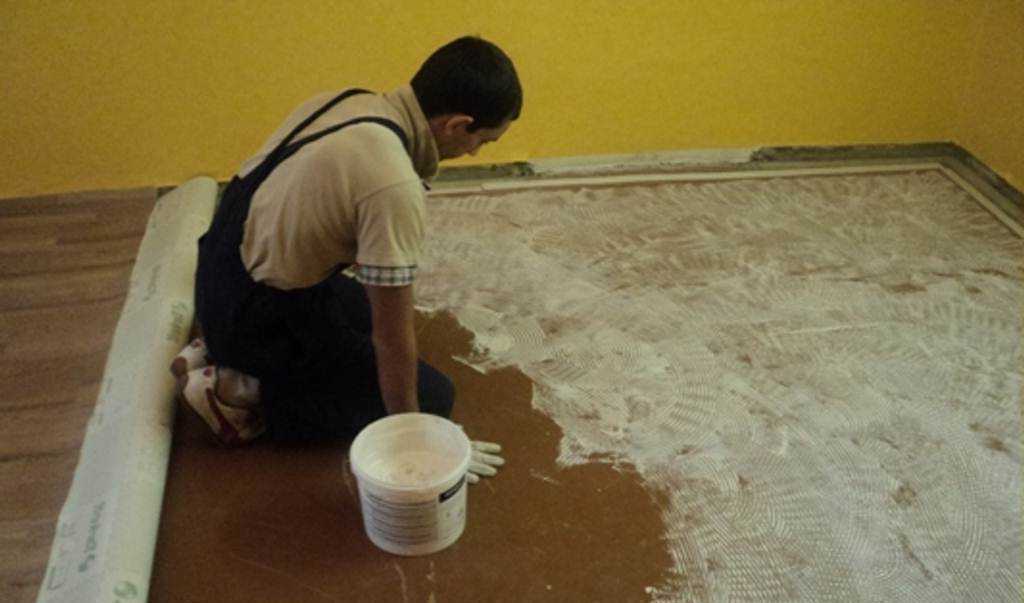 - постепенно разворачивают рулон, нанося на поверхность клей (после нанесения клея стоит выждать 20 минут, и только тогда фиксировать материал на настил);