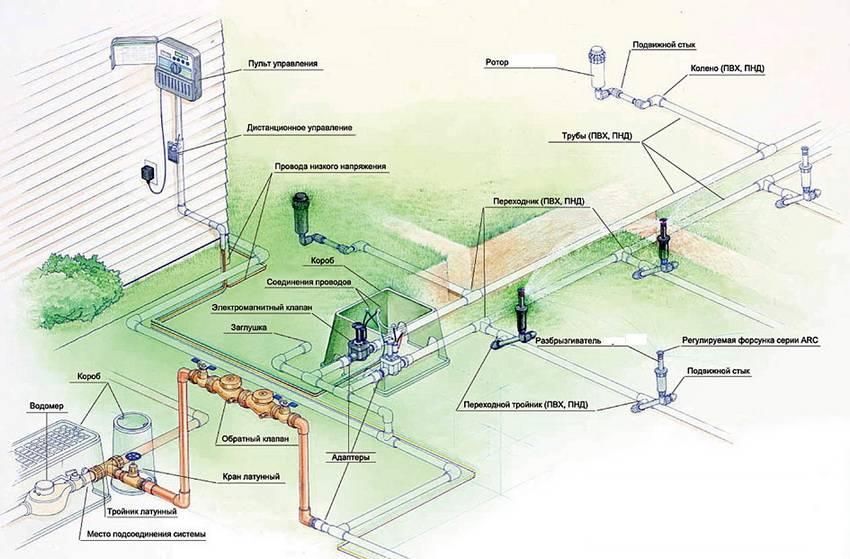 Установить систему орошения огорода или дачного участка можно по схеме. Такой механизм имеет контур дождевого или капельного полива.