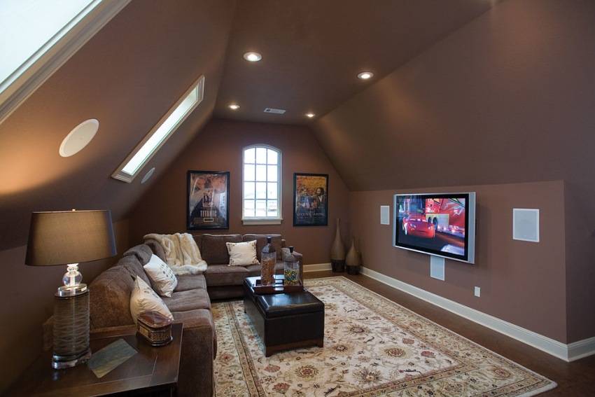 - Комната отдыха или кинозал. Даже если чердак имеет небольшую высоту, в нем можно обустроить небольшое помещение для просмотра фильмов или простого отдыха. Хорошая звукоизоляция защищает от посторонних шумов, а при желании можно еще и продумать акустические характеристики помещения, чтобы создать приятную атмосферу небольшого кинозала.