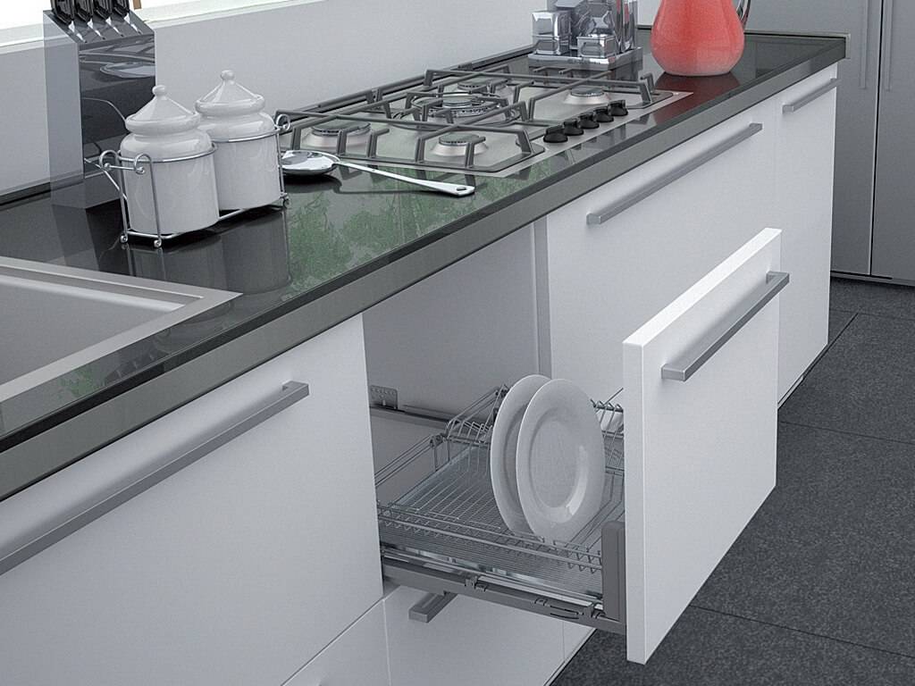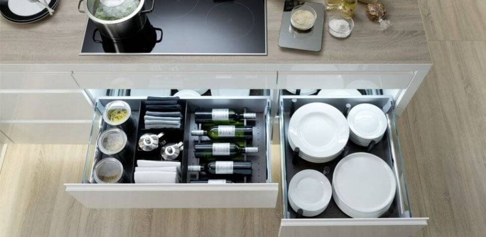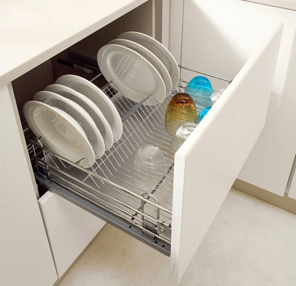 - В шкафах можно установить просторный контейнер-органайзер, который будет легко выдвигаться. Каждый отсек заполнить посудой по категориям. Если понадобится что-то вытащить, не придется доставать всю посуду, достаточно будет выдвинуть контейнер.