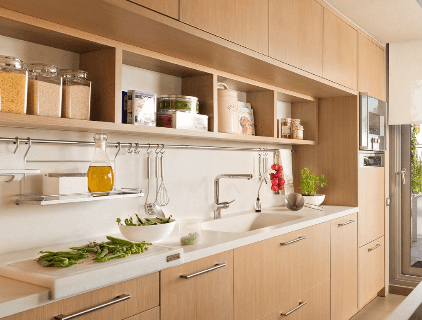 Вопрос о том, стоит ли делать открытые полки, остается спорным. С одной стороны это позволит быстро брать необходимое при готовке. А с другой – открытые полки требуют более частой уборки.