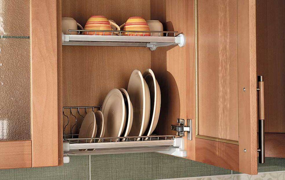 Отличным решением являются вставные полки и этажерки, которые можно разместить в шкафах. С помощью данных предметов значительно облегчается размещение посуды. Также можно получить дополнительно полезное пространство и использовать максимально место.