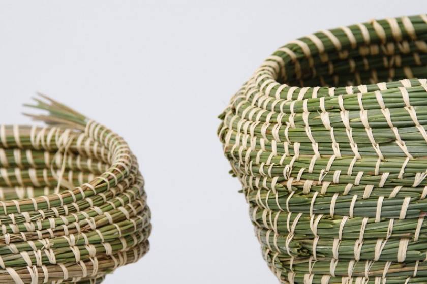Для основы возьмите небольшой пучок иголок и крепко обмотайте его нитками. Заворачивайте основу «улиткой», продолжая обматывать пучок. Постепенно добавляйте к нему новые иглы, чтобы толщина пучка была всегда одинаковая. Периодически пришивайте слои друг к другу, чтобы получилось крепкое изделие. В зависимости от размера будущей чаши постепенно делайте загиб, чтобы сформировать углубление. В конце стежками дооформите край, чтобы чаша выглядела аккуратно.