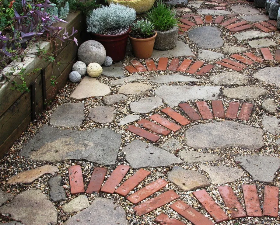 - простоту укладки. Для мощения садовых тротуаров и тропинок из фрагментов кирпича требуются лишь базовые знания по работе с материалом и простой набор инструментов;