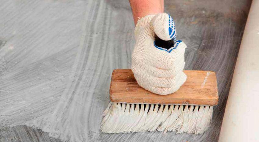 Настил линолеума можно выполнять только на предварительно прогрунтованное основание. Для нанесения грунтовки можно использовать любые предназначенные для этого приспособления.
