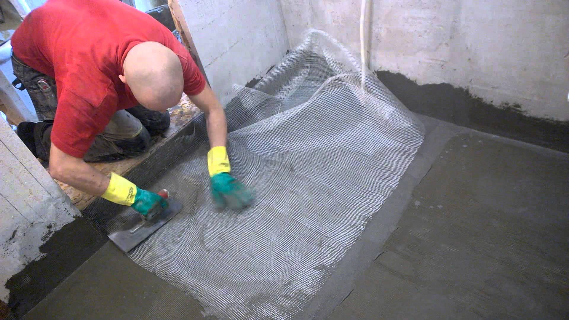 Наиболее надежные — рулонные материалы. Но допускается применение обмазочных растворов на полимерцементной основе. Перед обмазкой защитным раствором угловые швы пола и стен дополнительно проклеивают гидроизоляционной лентой.