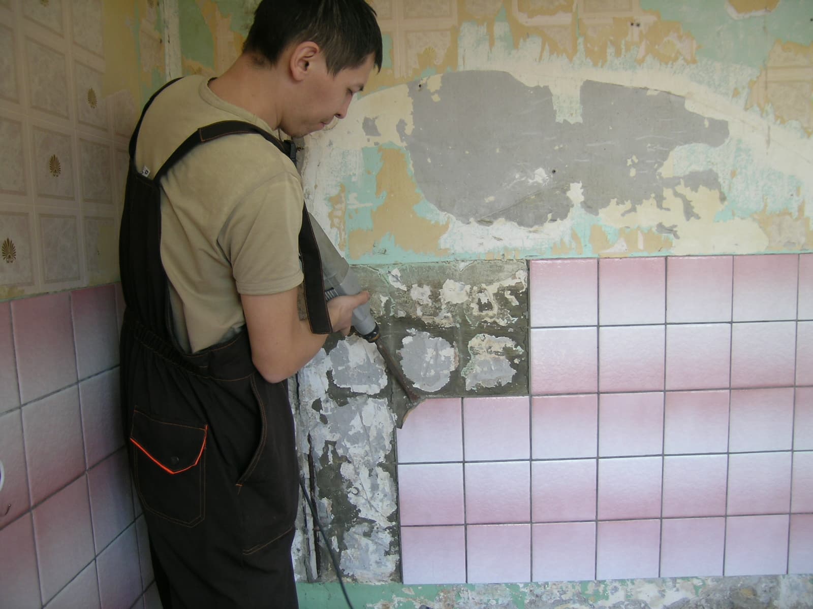 Краску счищают либо вручную, либо с использованием угловой шлифовальной машинки с соответствующей насадкой — зависит от прочности сцепления с основой. Плитку сбивают зубилом и молотком или перфоратором с насадкой «лопатка».