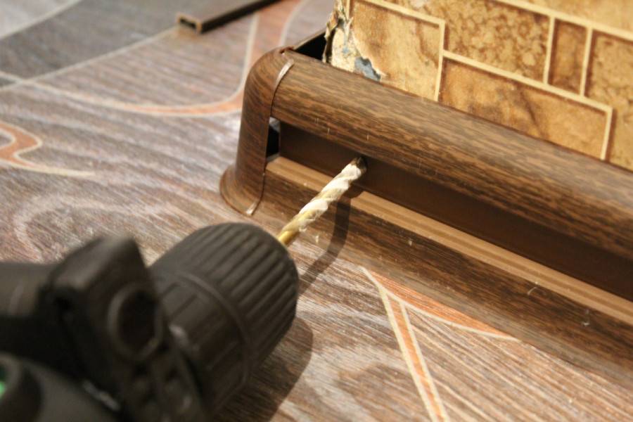Можно поступить проще и просверлить плинтус насквозь до соприкосновения сверла со стеной