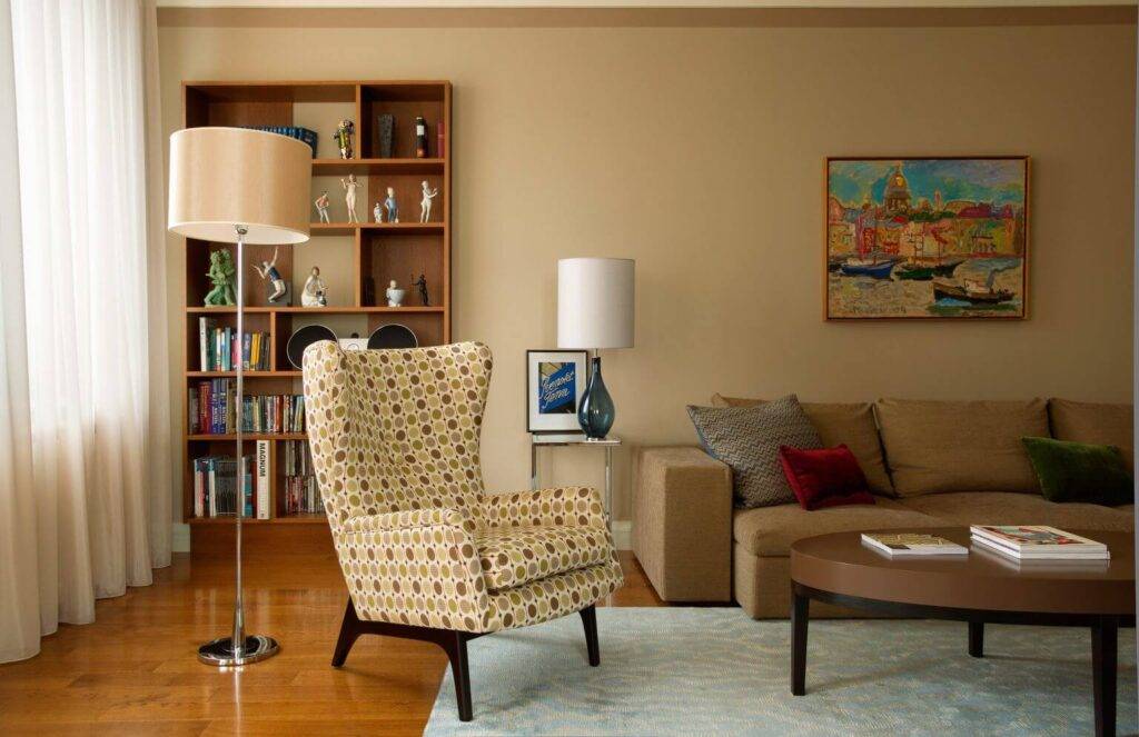 В ретро стиле приветствуются яркие краски, поэтому пространство можно украсить настенными коврами. Мебель той эпохи: невысокие стенки, трюмо подойдут для гостиной. Буфет или сервант старинного стиля отлично впишутся на кухне, в них можно установить посуду с декором того периода.