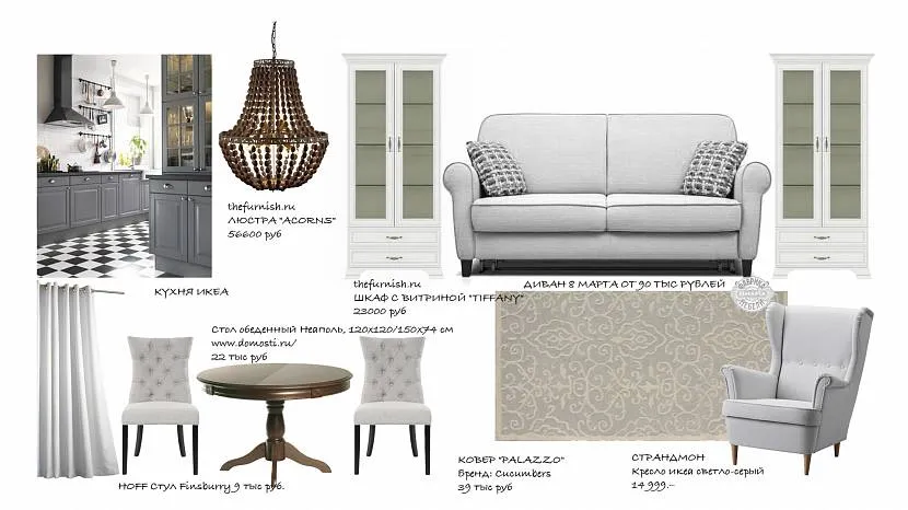 - Подробный. Стилистические решения для каждого помещения, обычно они проработаны более детально. Дизайн-борд гостиной или кухни содержит конкретные предложения по материалам и предметам мебели.