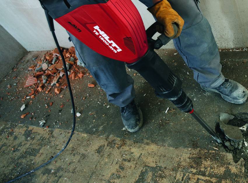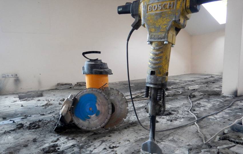 При наличии неровного или повреждённого слоя стяжки, аккуратно разбиваем его с помощью молотка. При нахождении под ним изоляции, затем поддеваем её с нижней части и взламываем по целой площади. Устранение касается всех слоёв до плиты.