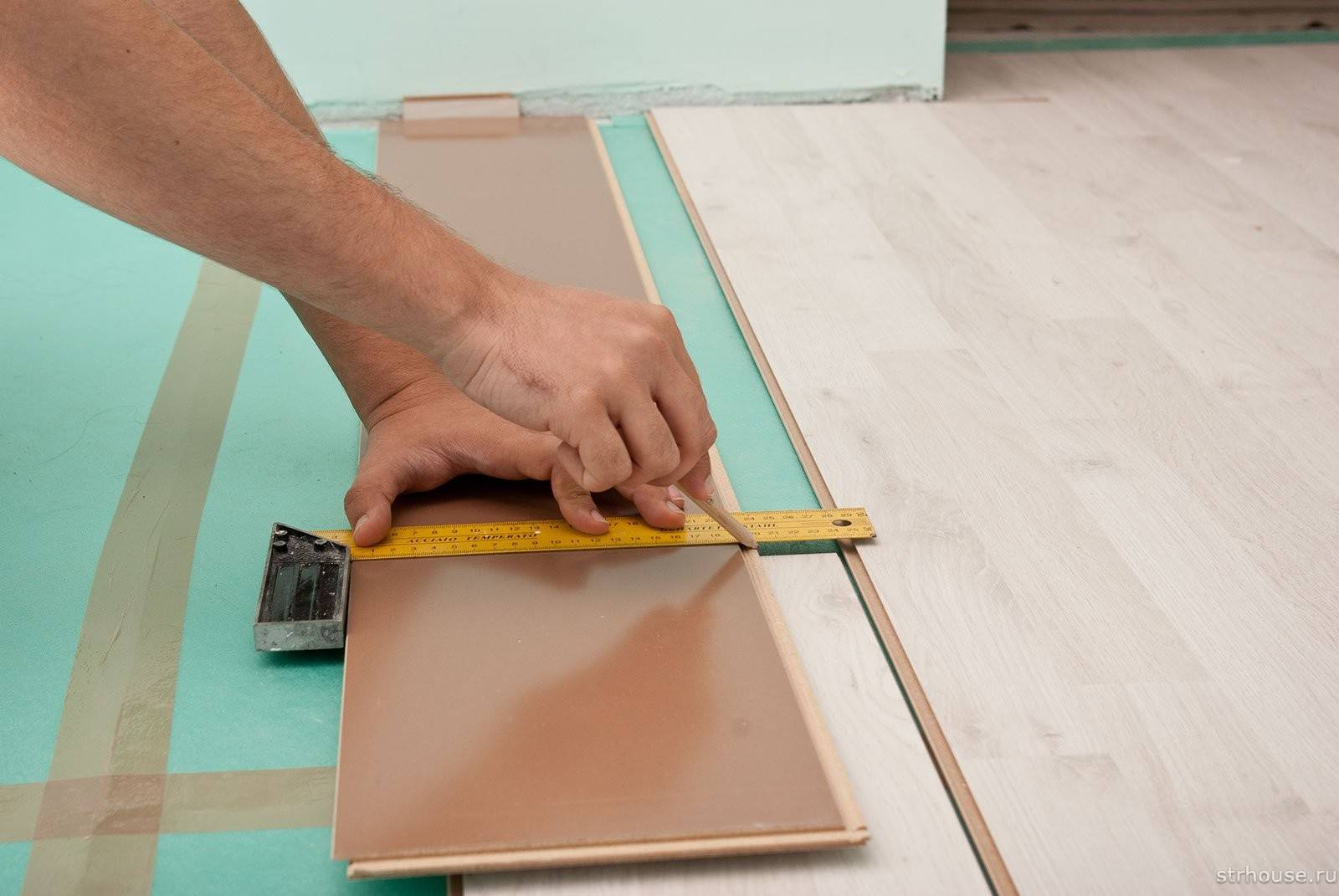 Последняя ламинтная доска, как правило, по размеру оказывается больше. Недопустимо, чтобы она была короче 30 см. Если так вышло, то первую доску в ряду подрезают.