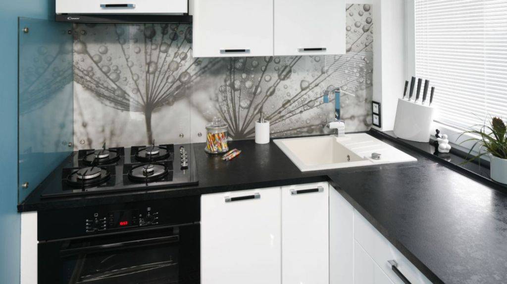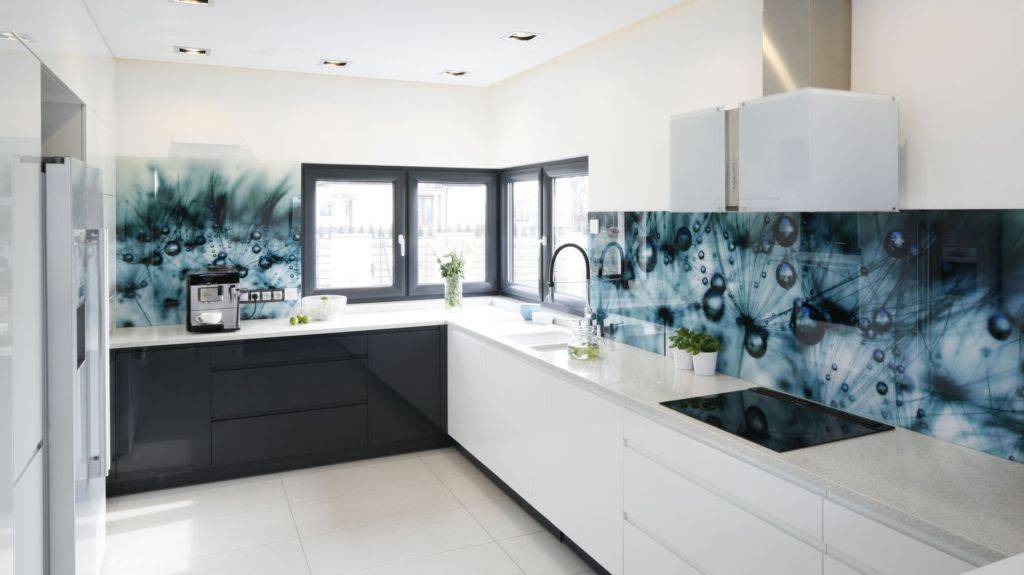 Стеклянные панели с цветочным узором над кухонной столешницей