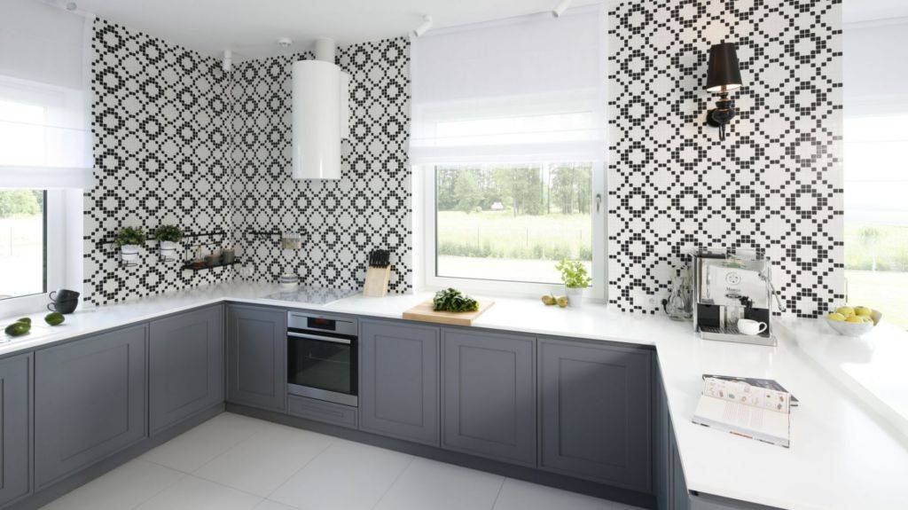 Интересным решением являются водостойкие обои для плитки или шпона. Однако не деревянные — они не подходит для стены между нижним и верхним шкафами на кухне, поскольку они не очень устойчива к влаге. Тем не менее, каменный шпон, который сделан из кристаллического сланца, соединенного с полиэфирной смолой будет идеален.