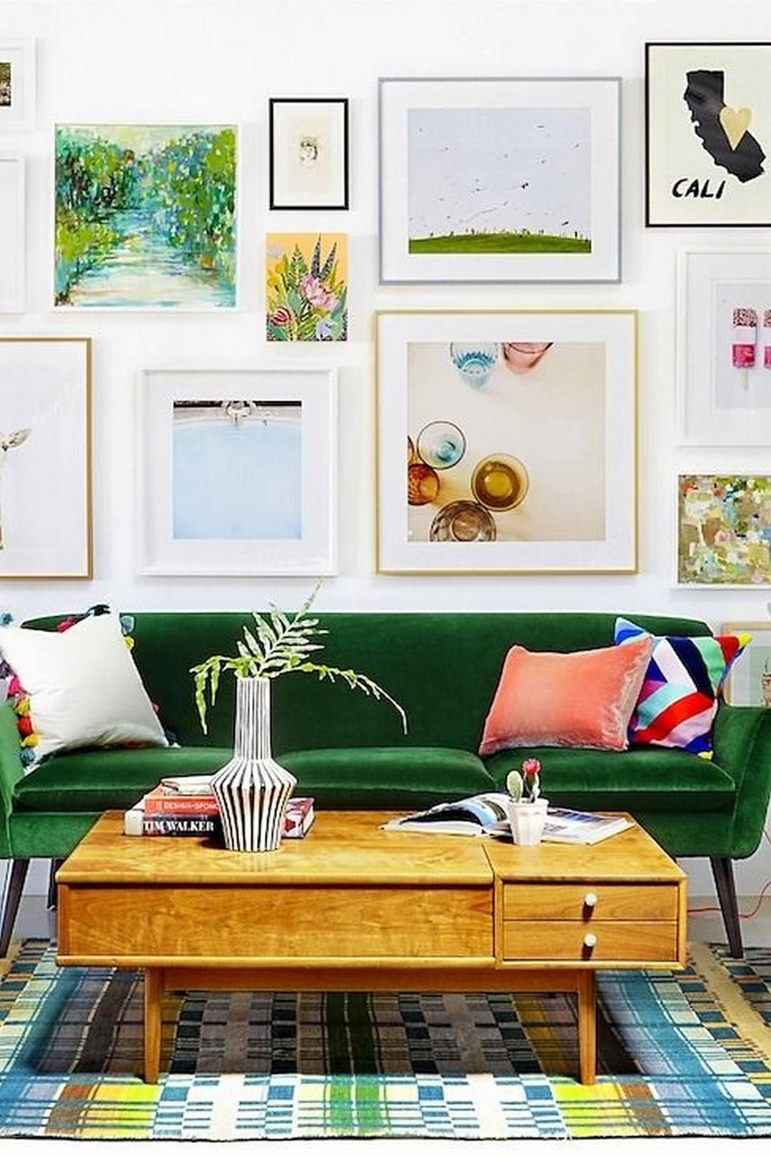 Если располагаете картины над диваном. То не вешайте их слишком высоко, достаточно отступить от спинки 25-30 см.