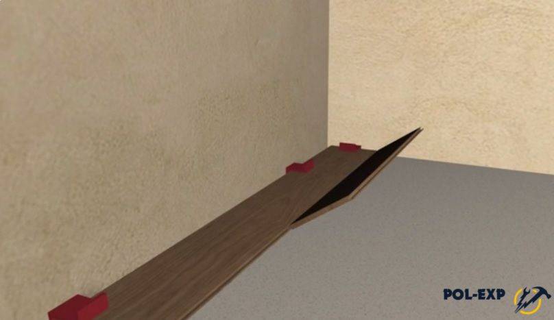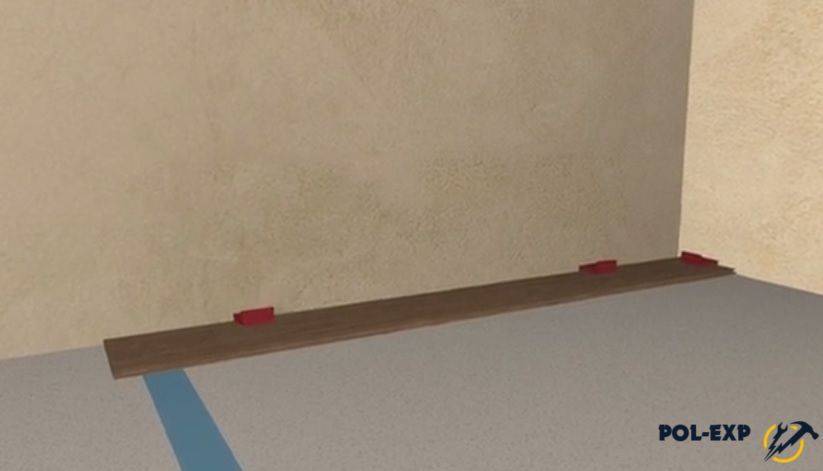 Шаг 10. После окончания работ клинья у стен вынимаются, а зазоры закрываются плинтусами.
