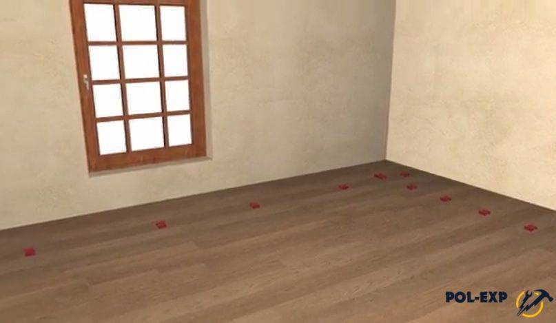 Класть ламинат нужно с отступом от стены 8-10мм. Для этого используем заранее нарезанные колышки. При укладке первой доски их засовывают и с узкой и с широкой стороны. Если вы уложите ламинат вплотную к стене – он может вздуться (встать дыбом). Так как обладает свойством расширяться (сужаться) при перепадах температур. После завершения работ по укладке эти клинья снимают; Перед укладкой ламината нас интересует ширина комнаты (замеряем рулеткой). Это нужно, чтобы узнать размеры (по ширине) доски в последнем ряду (минимум 5-10см). Делим ширину помещения на ширину ламели + отступ от стены с 2 сторон по 1см; Застилаем пароизоляционную пленку по всей комнате. Можно немного внахлёст на стену. Затем склеиваем скотчем стыки; Наверх на клеенку укладываем подложку для ламината