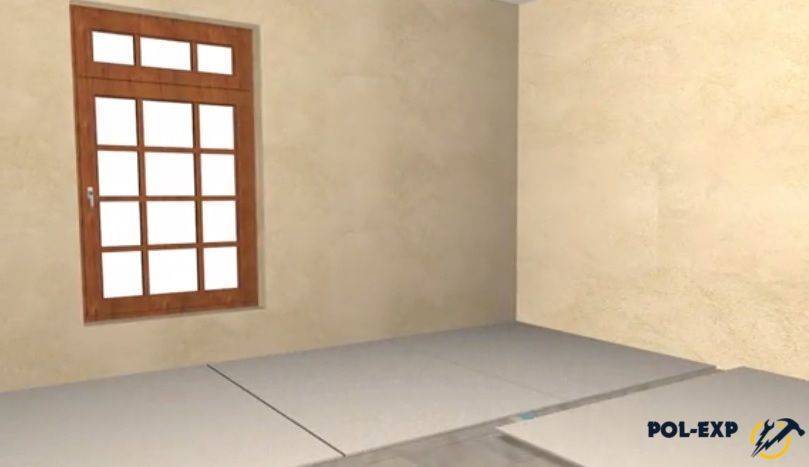 Шаг 4. Далее укладывается амортизационная подложка. Листы следует класть стык в стык, здесь нахлест не нужен, он только сделает основание кривым. Края могут быть состыкованы при помощи липкой ленты.